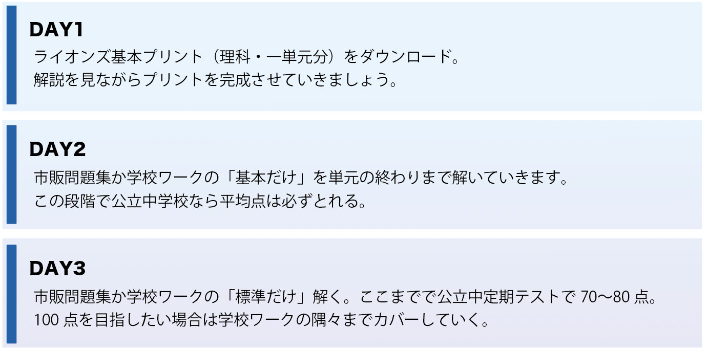 まず、ライオンズ方式で学習内容の本質を”最短最速で”つかまえ 学校ワークや市販問題集に取り組む、 というシンプルな順序です。
